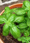 Sweet Basil, Ocimum basilicum. The basil leaves may taste somewhat like anise, with a strong, pungent, often sweet smell. Basil is used fresh as well as dried in soups and other food. Fresh leaves are also used to thicken soups. The flower buds have a more subtle flavor and are edible.