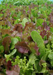 Mesclun Lettuce, Lactuca sativa. The traditional mix includes Chervil, Arugula, leafy lettuces and Endive in equal proportions; but modern mixes may include an undetermined mix of fresh and available lettuces, Spinach, Arugula, Mustard greens, Endive, Frisée, Mizuna, Lamb's lettuce, Radicchio, and Sorrel. Most lettuce is used in salads, soups, sandwiches, and wraps.